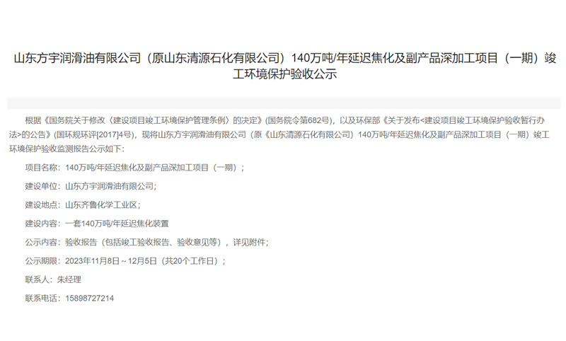 山東方宇潤滑油有限公司(原山東清源石化有限公司)140萬噸/年延遲焦化及副產品深加工項目(一期)竣工環(huán)境保護驗收公示